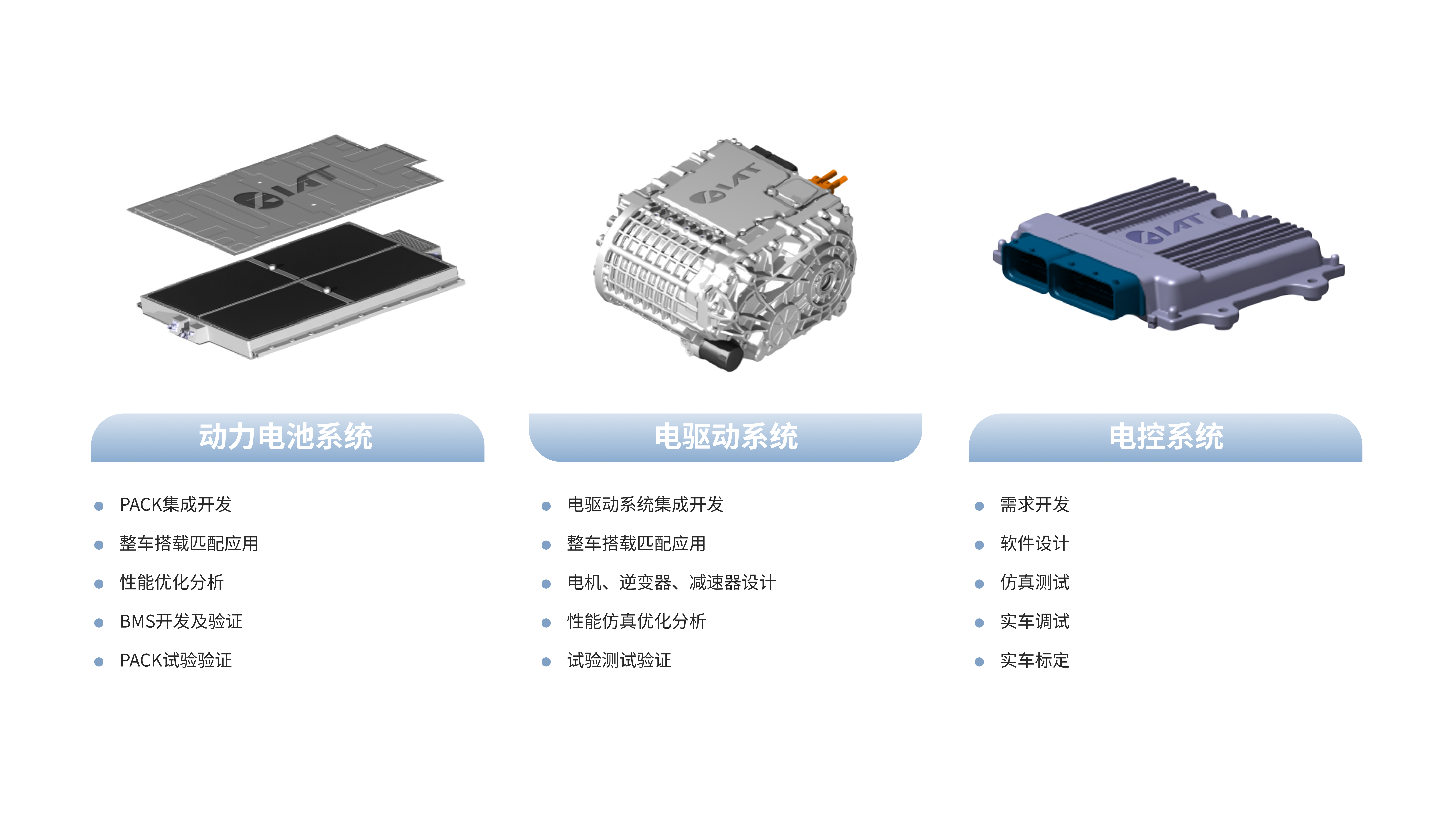 在新能源汽车三电领域,集合国内外专家及高端人才团队,掌握前沿开发技术,在零部件开发及验证、整车集成开发及搭载应用等领域具有深厚的研发实力和多款车型的成功案例,可为客户提供多样化解决方案