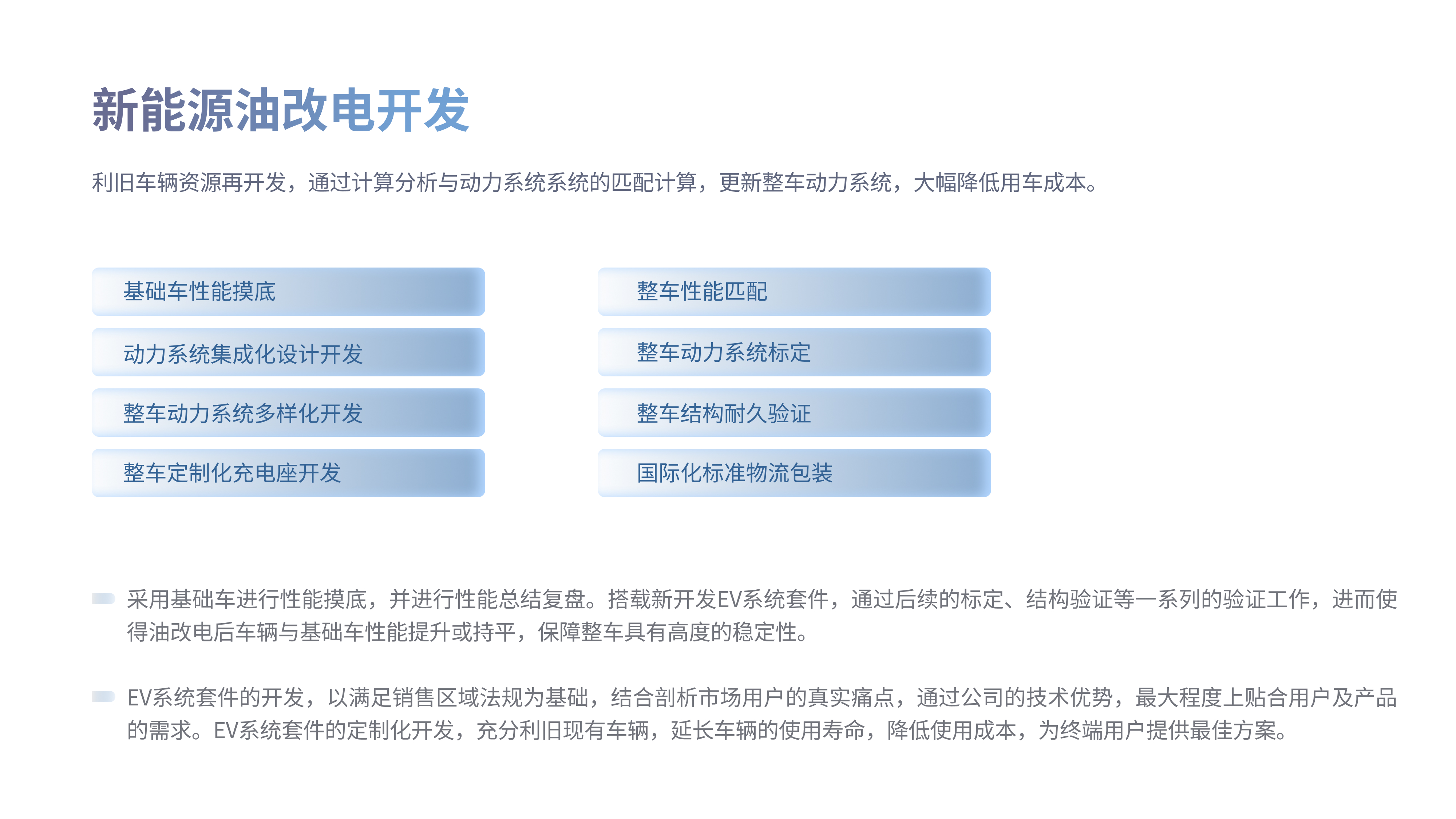 利旧车辆资源再开发,通过计算分析与动力系统系统的匹配计算,更新整车动力系统,大幅降低用车成本